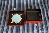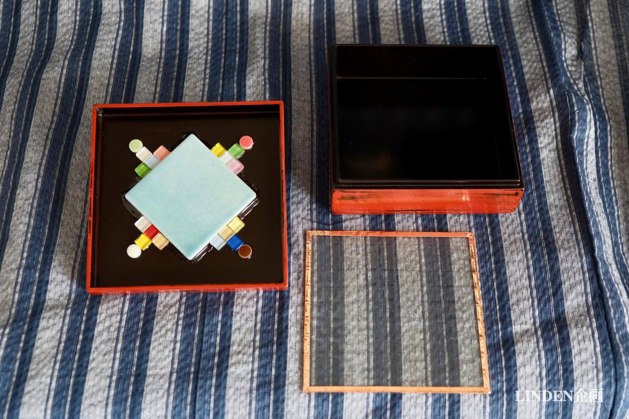 蓋の内側には中央に7.3cm角の水色タイルを貼り、周辺に1cm角のガラスモザイクタイルを使って模様を作り出してあります。