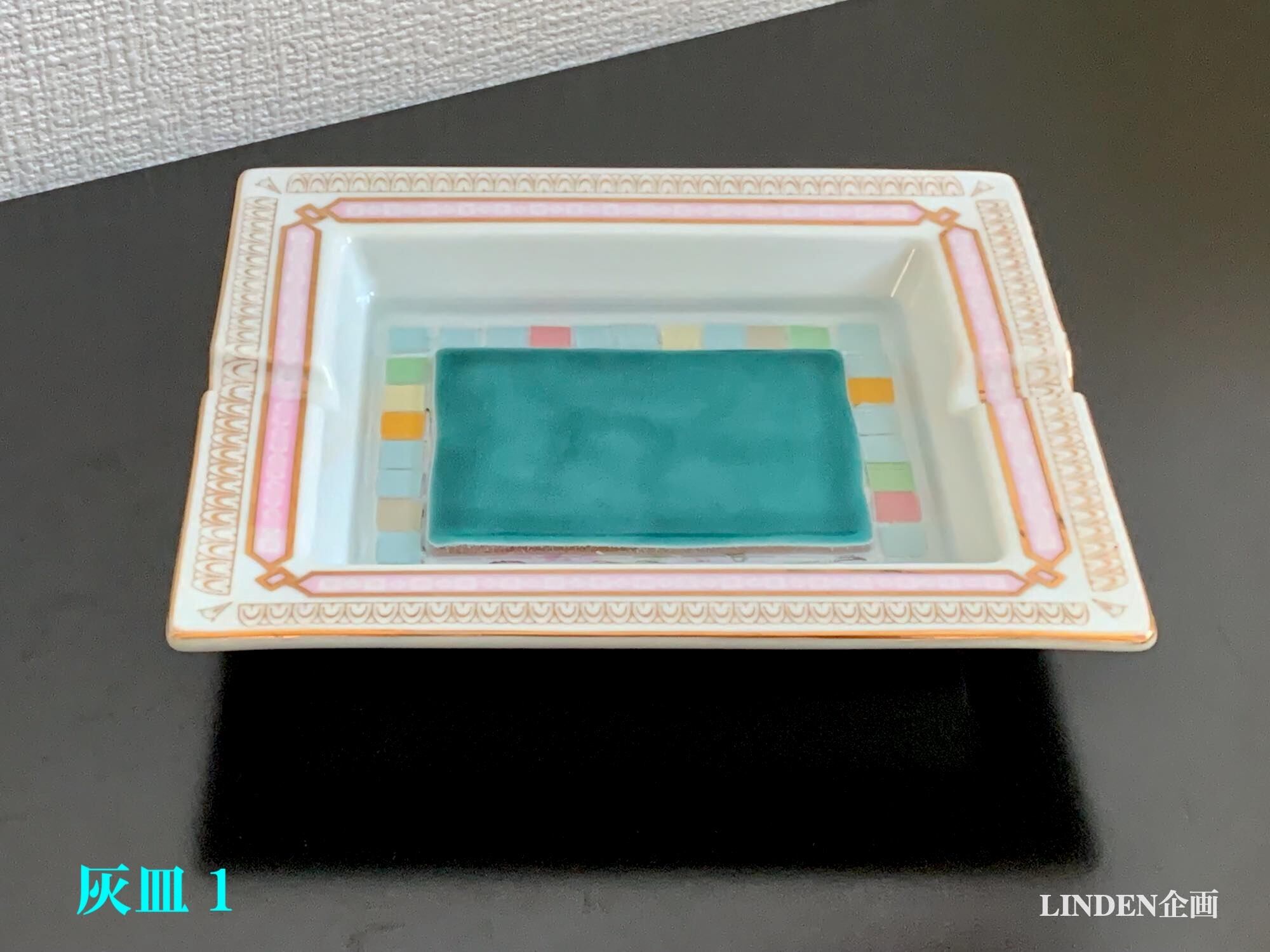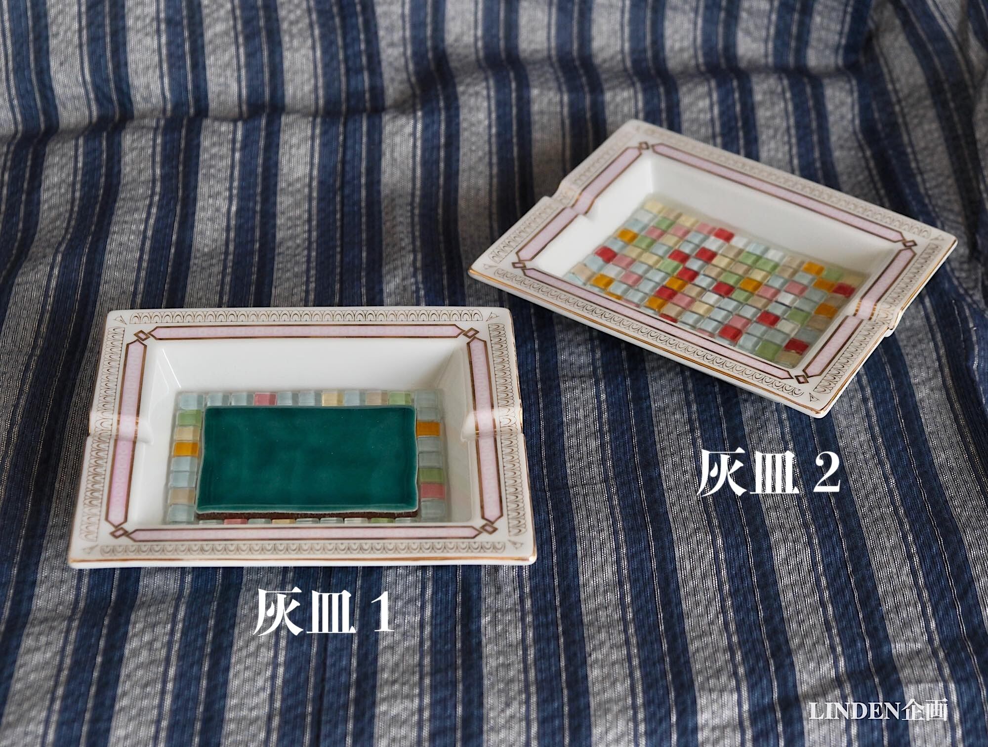 灰皿1:内面中央に青緑釉タイル(東濃製)を貼り、周囲を1cm角のガラスモザイクタイルで囲みました。目地材は入れてありませんが、周囲にタイル固定用の透明な充填剤を使い、透明な硬質樹脂でコーティングしてあります。重さ約700g