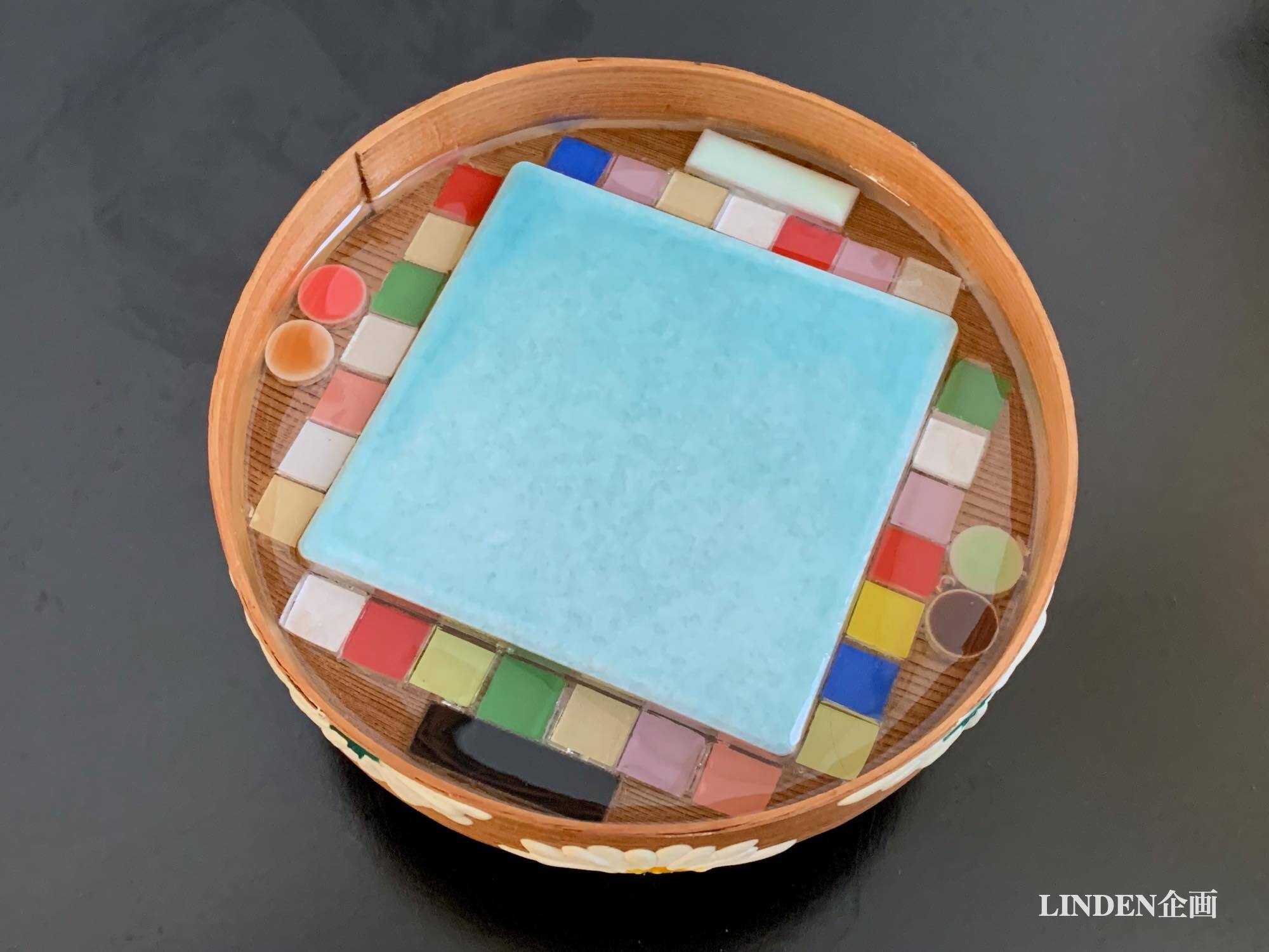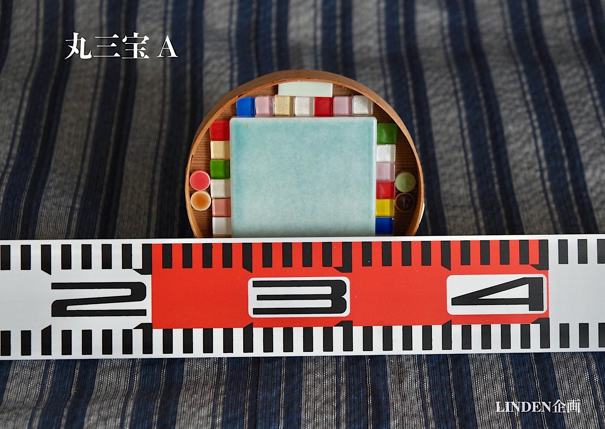 丸三宝A:7.3cm角の水色タイルと、1cm角のガラスモザイクタイルや各種モザイクタイルを使ってコンポジションしました。目地材は入れてありませんが、モザイクタイル部分は透明の硬質樹脂でコーティングしてあります。重さ約160g