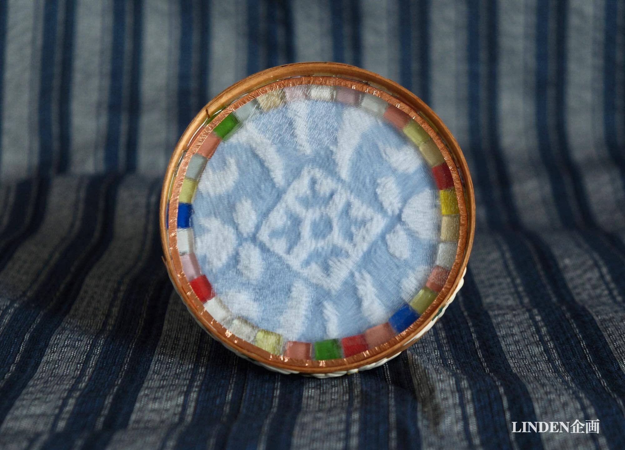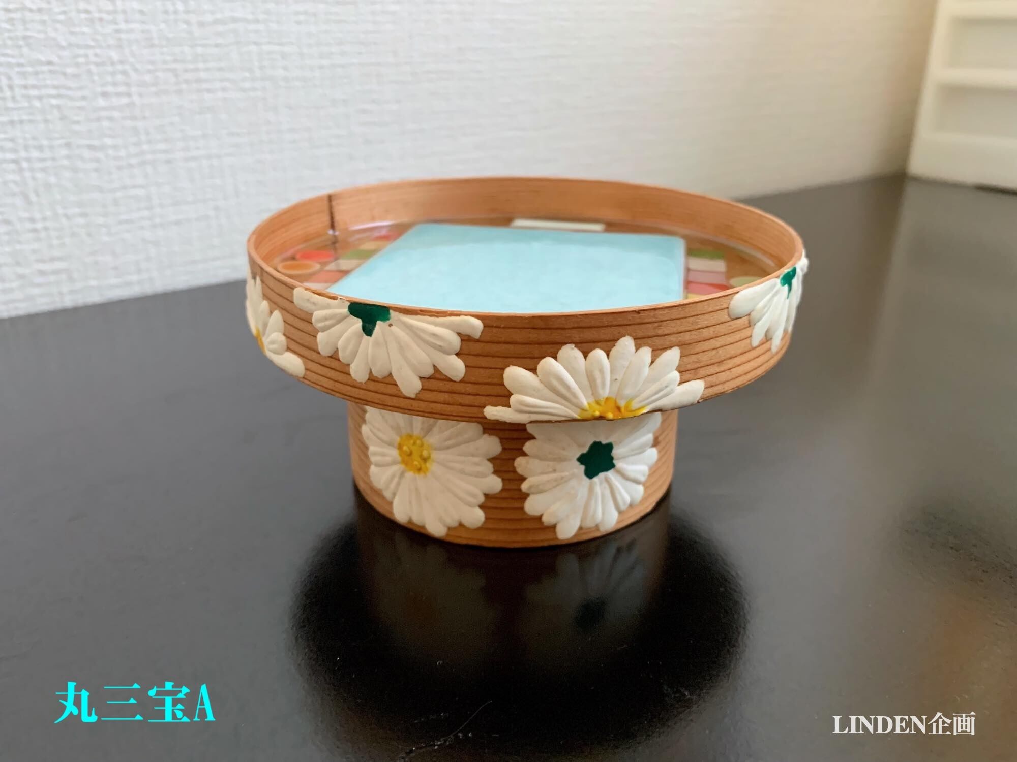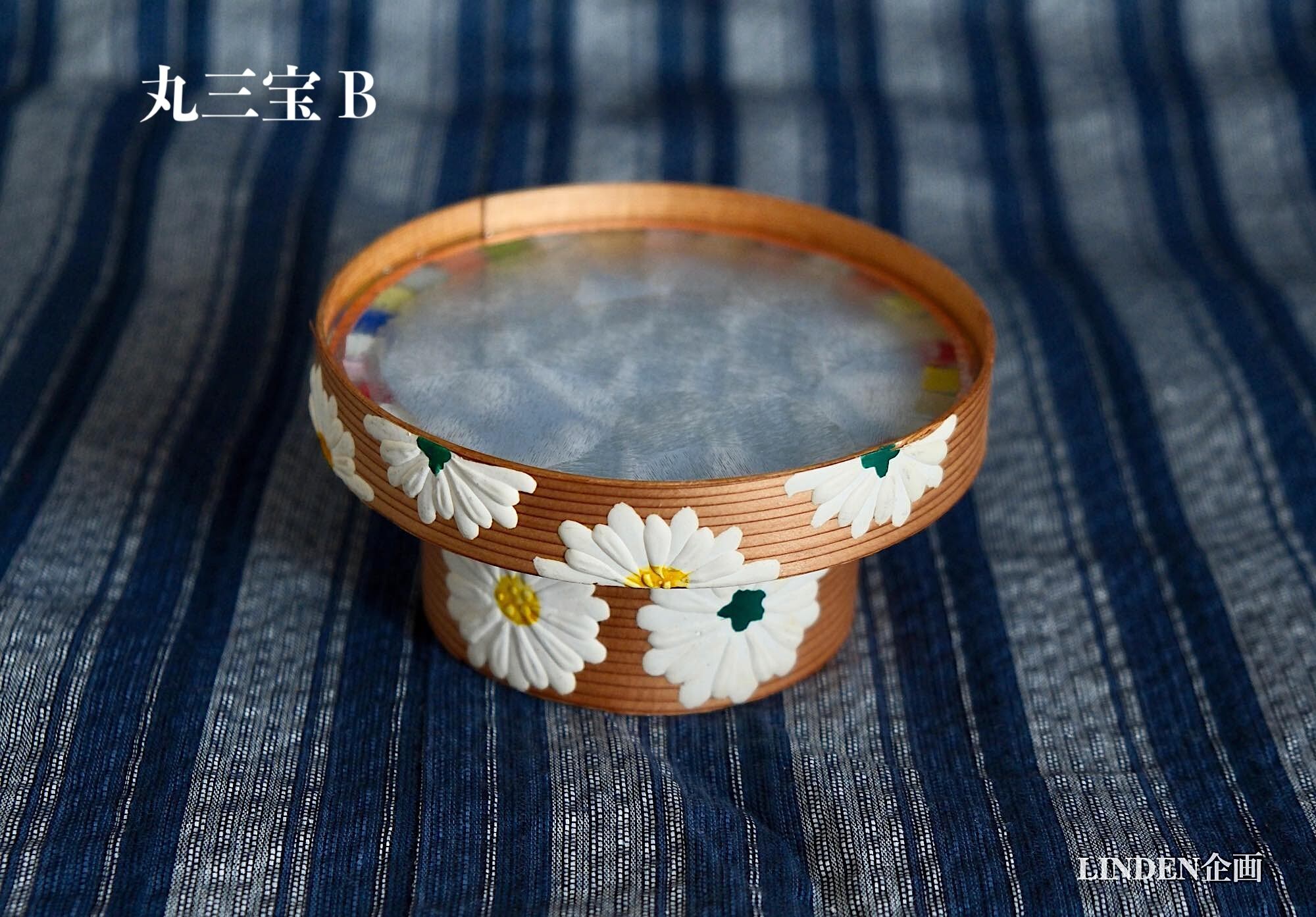 いずれも大きさは直径12cm、高さ6cm、高台の径8cmです。正面に胡粉の盛り上げで菊花が描かれています。剥落の様子はありませんが、念のため表面はツヤ消しのニスでコーティングしてあります。薄い板材の曲物なので、重量物は乗せられません。小さな置物やお人形、仏像、一輪挿しなどの台としてご利用ください。