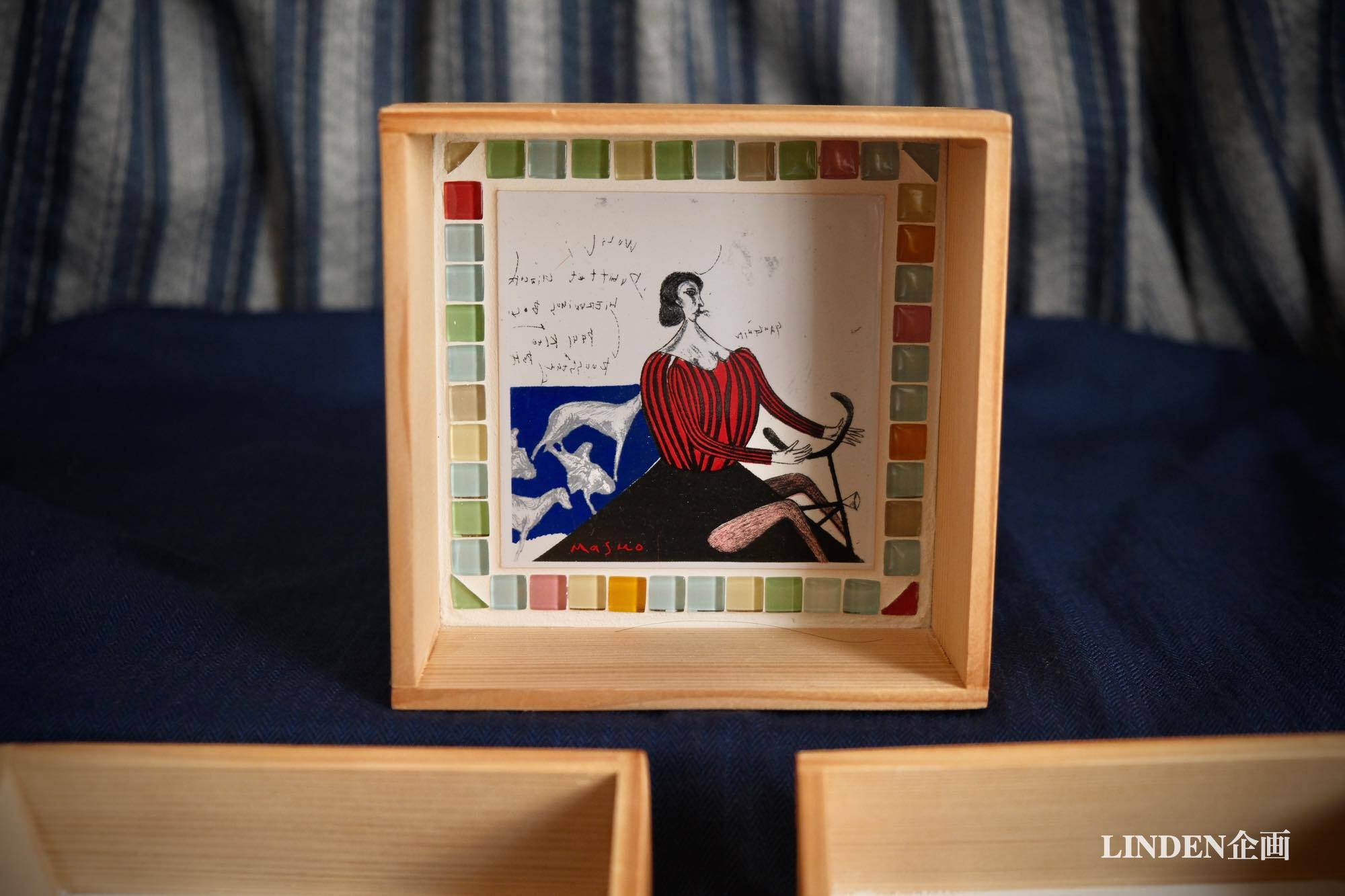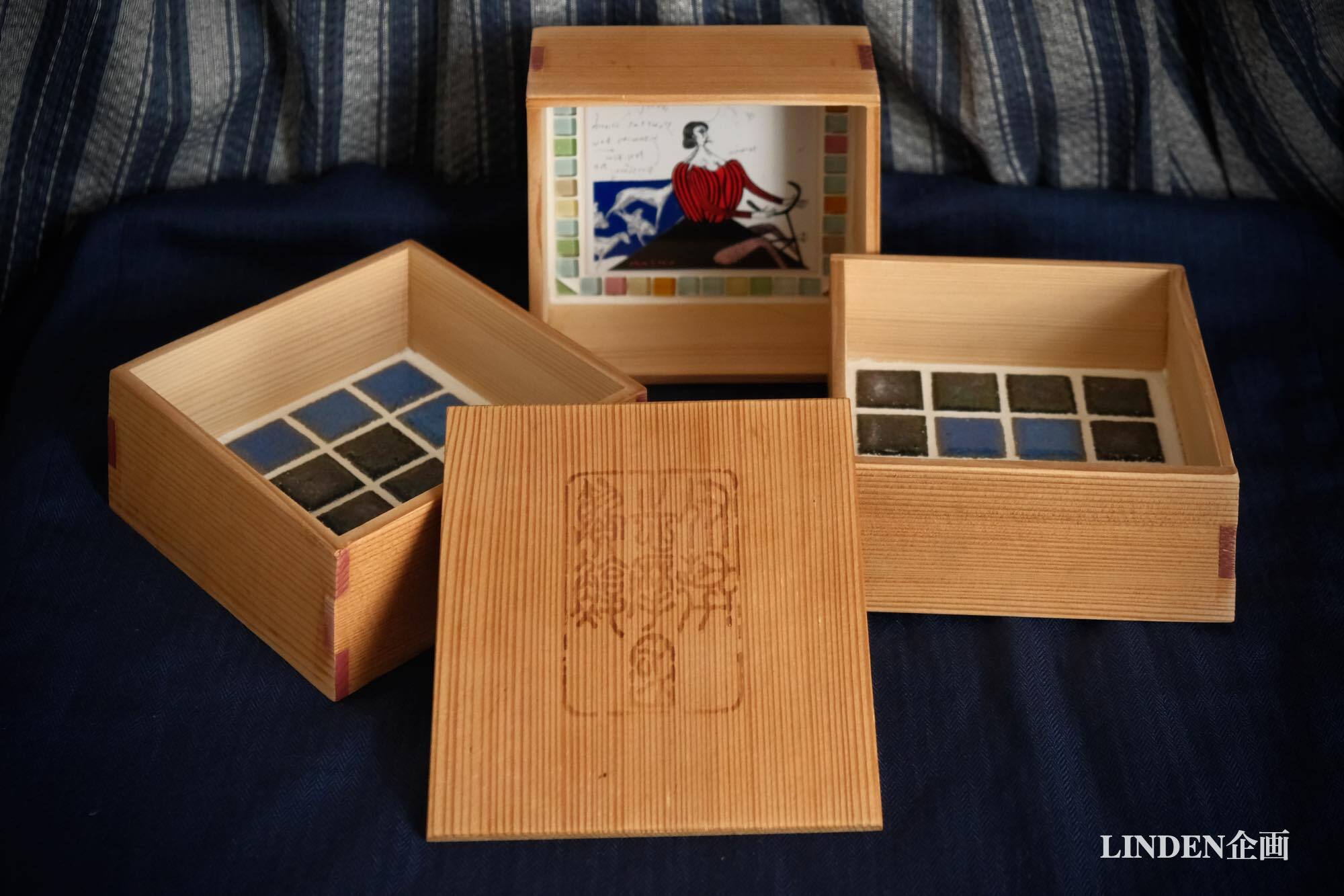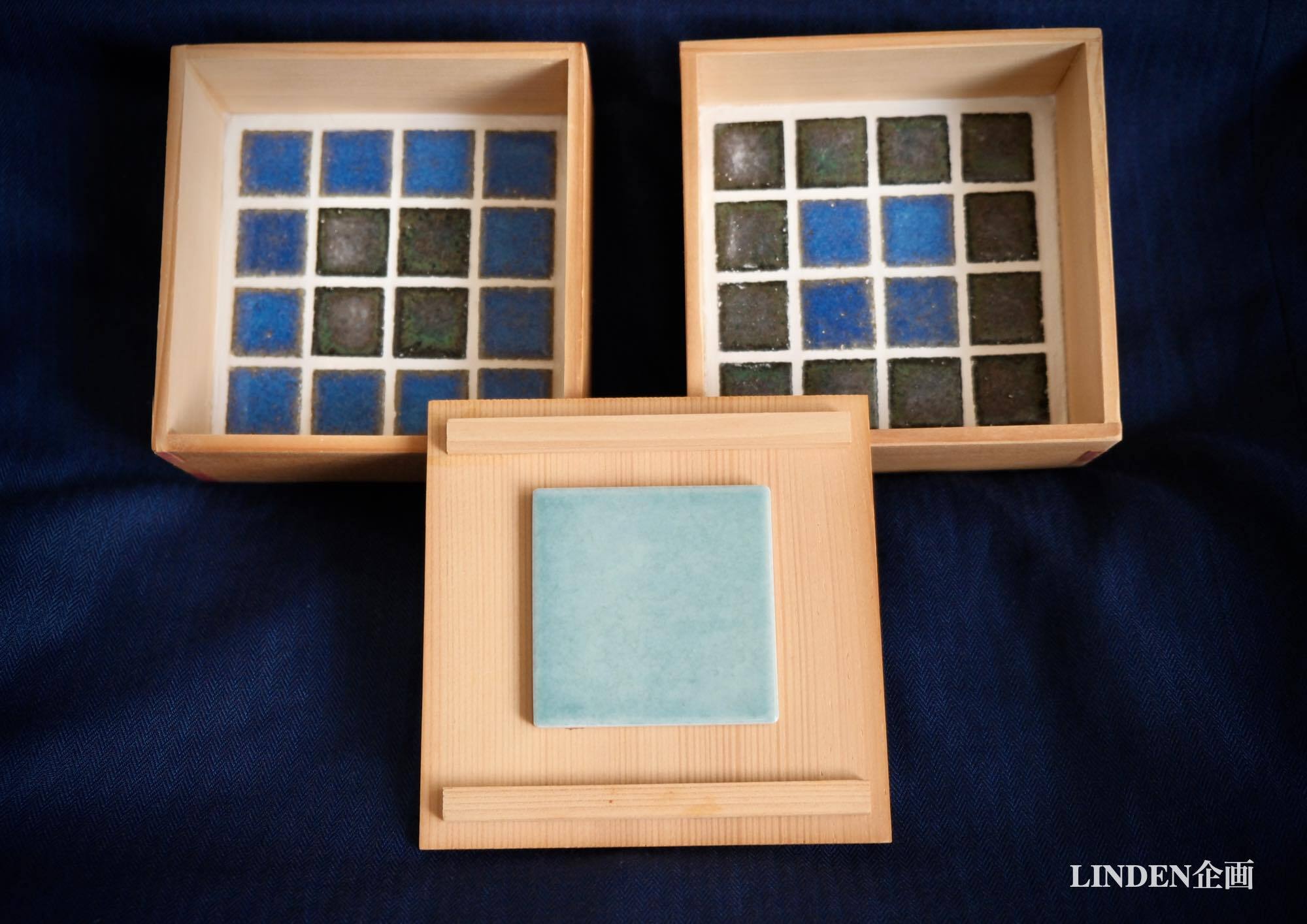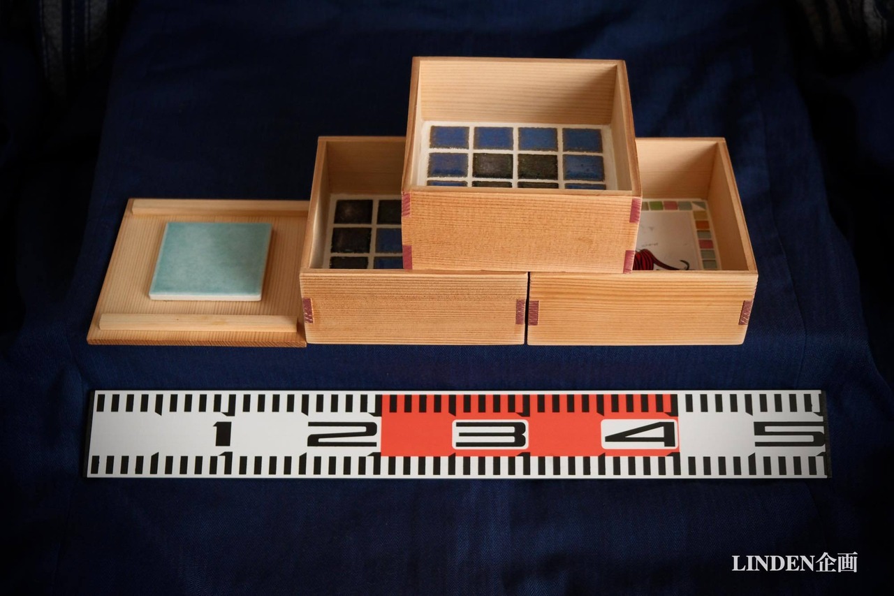 一の重には中央に池田満寿夫デザインの美術タイルを置き、周辺に1cm角のガラスモザイクタイルを配置しました。目地材を入れてあります。