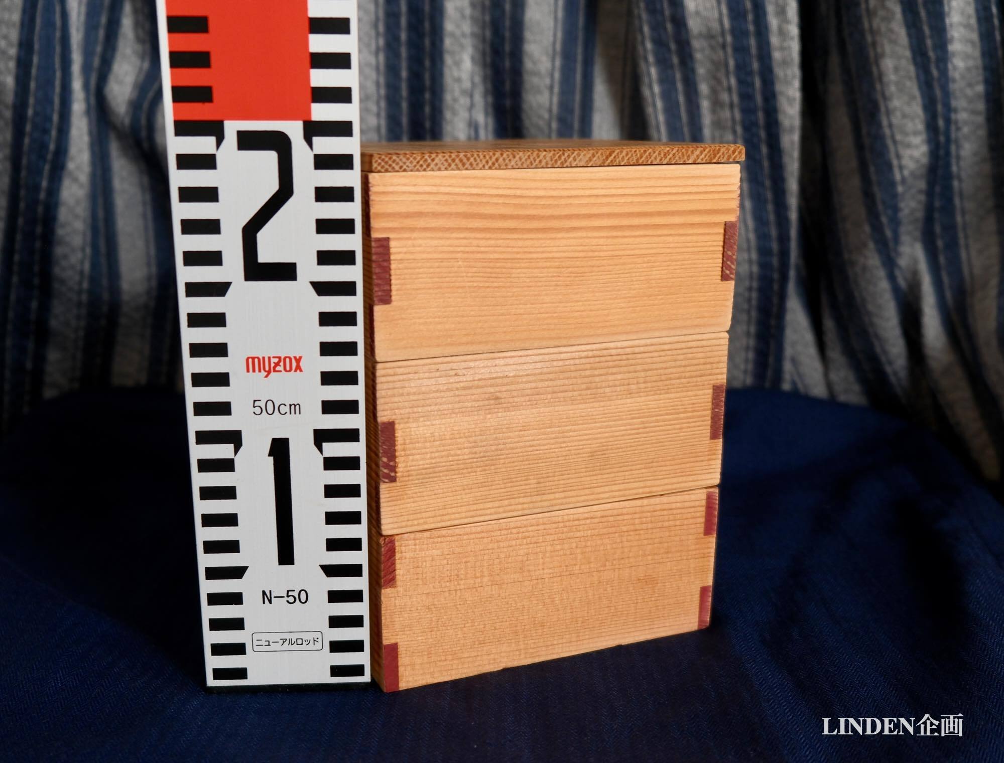大きさは、一段が13.8cm×13.8cm×高さ6cmで、蓋(14cm角)を入れた高さは19cmです。一の重と二の重の底には下駄高台があります。