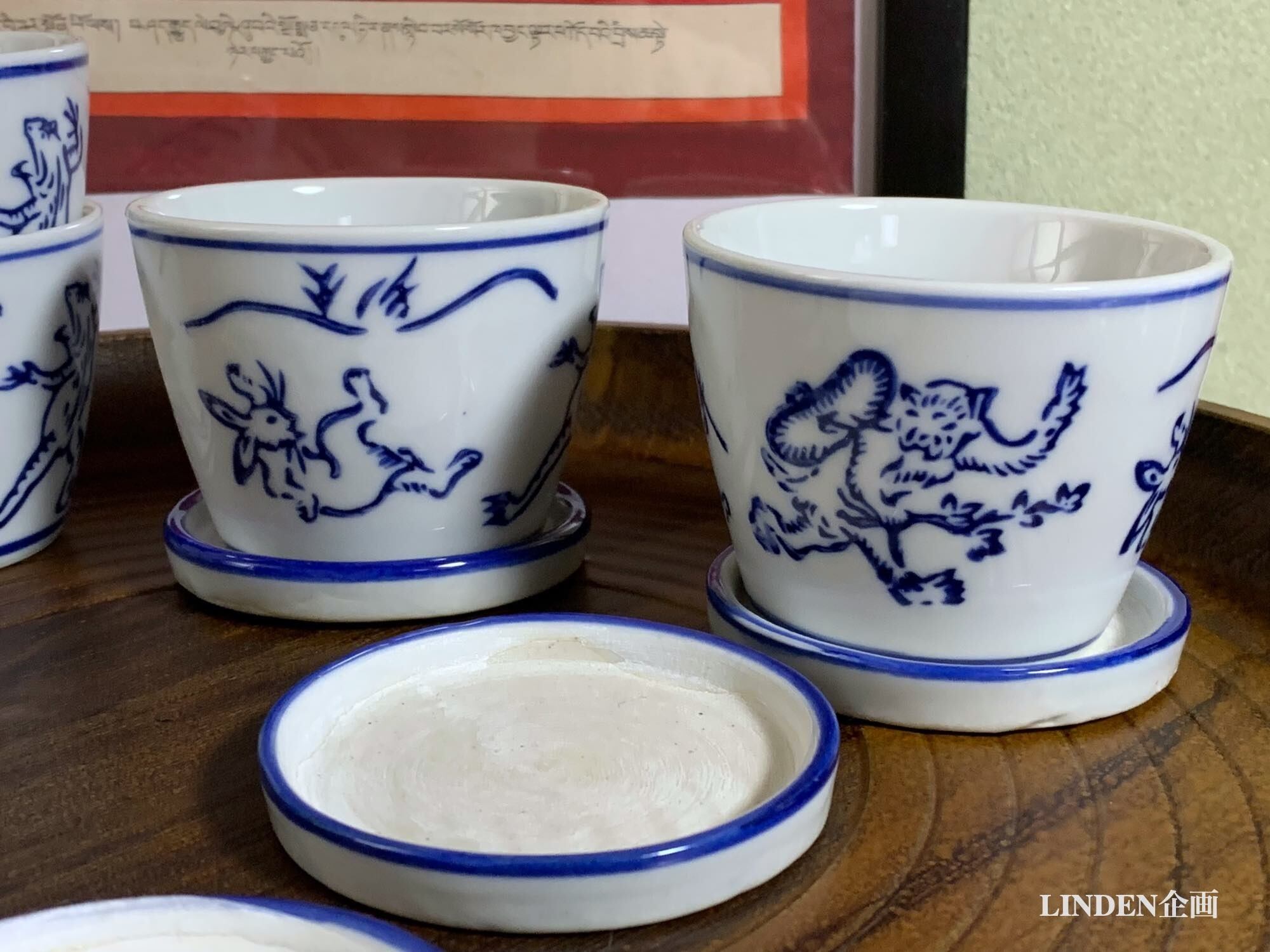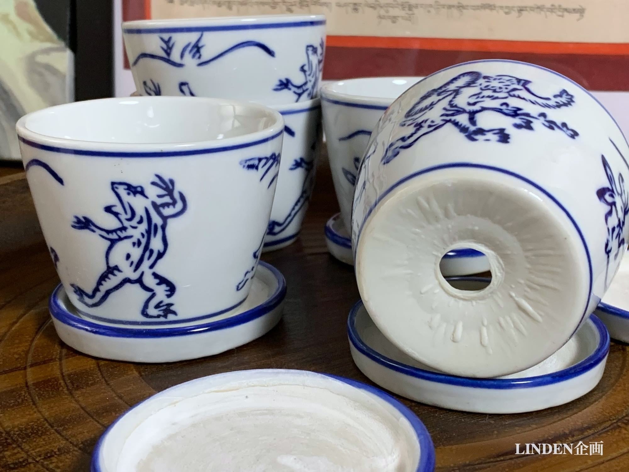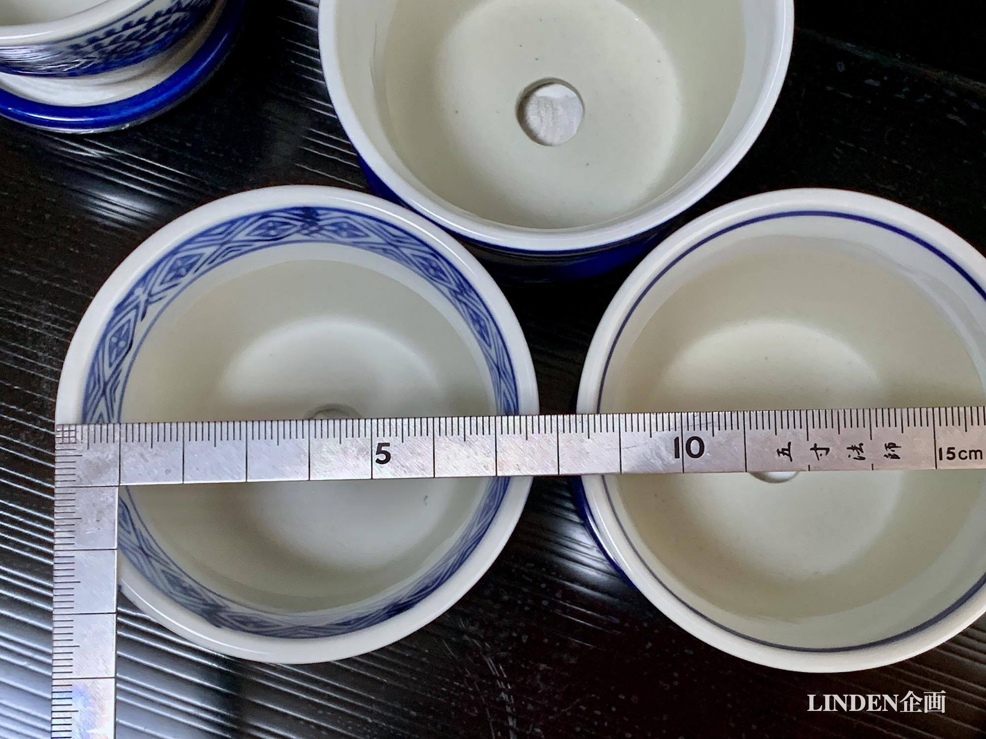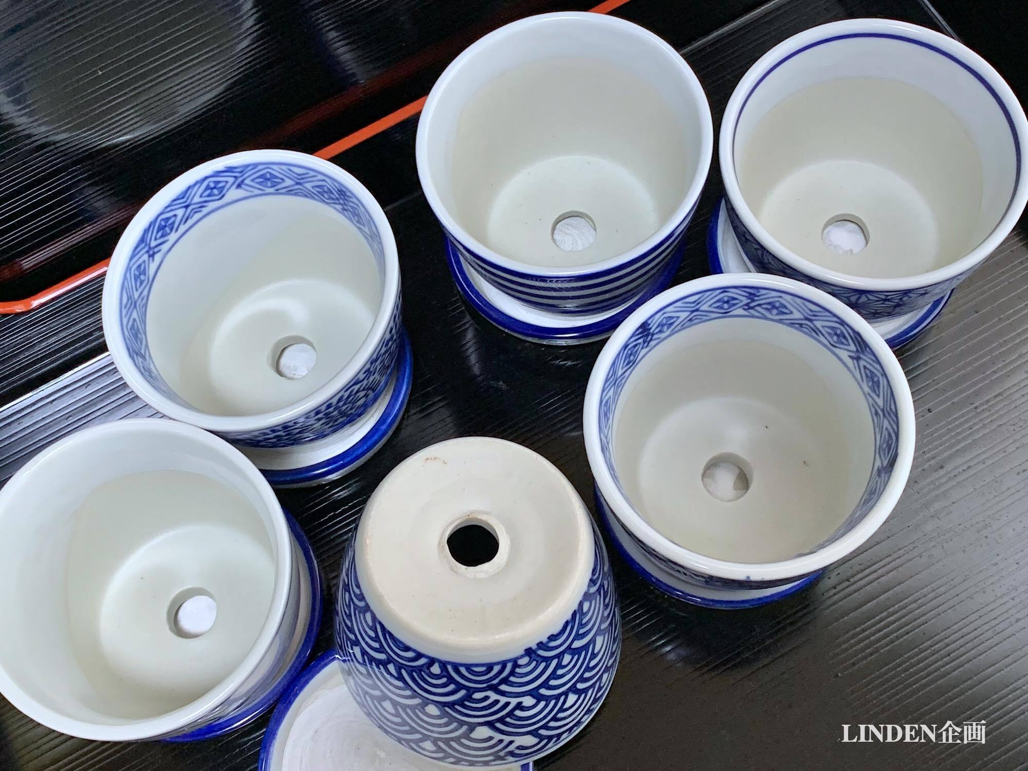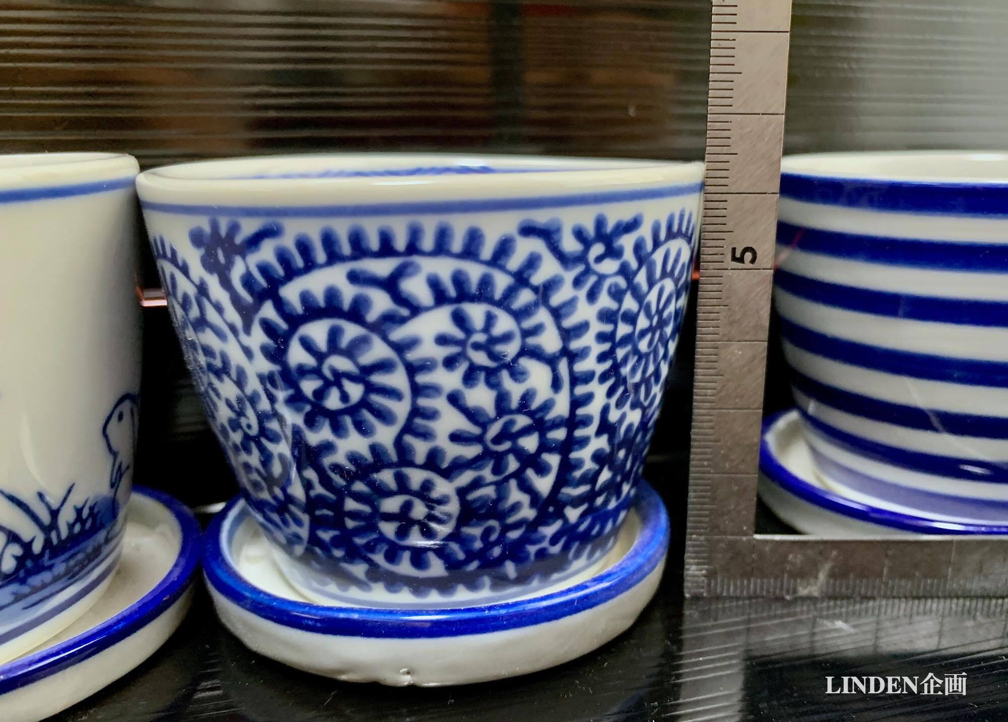 見た目は染付の蕎麦猪口そのものですが、実は底に穴が開いていて受け皿とセットになったミニ植木鉢(磁器)です。