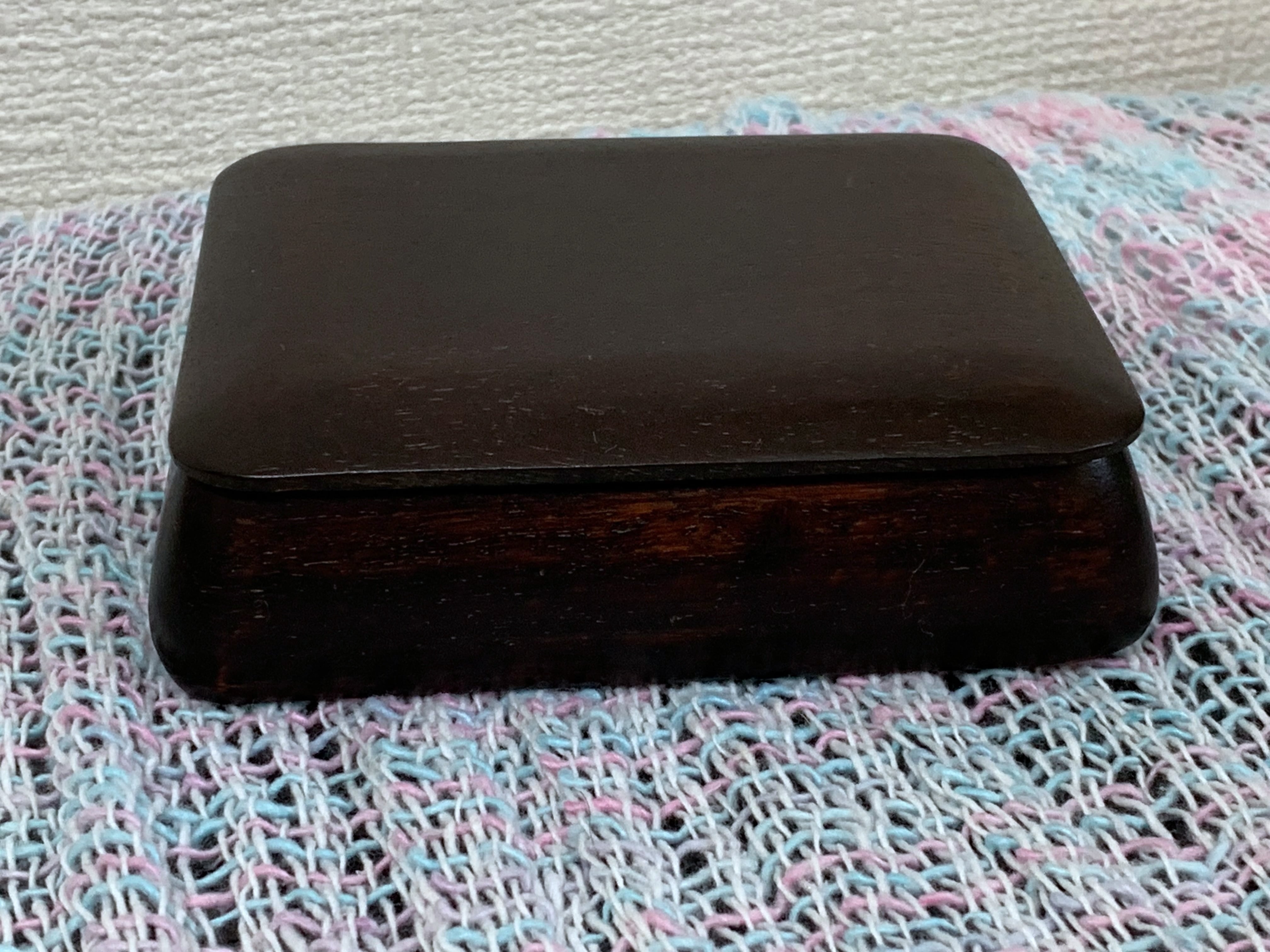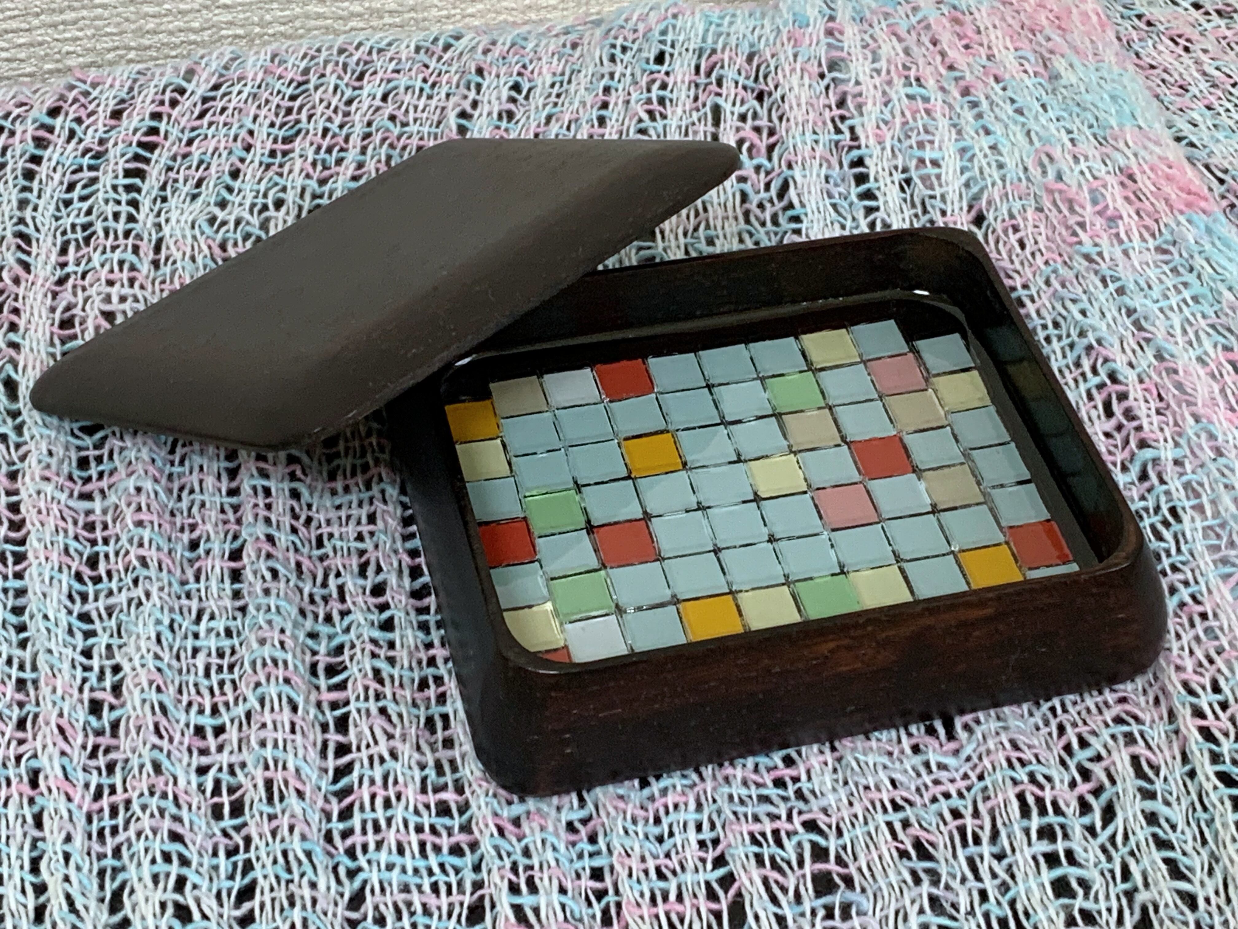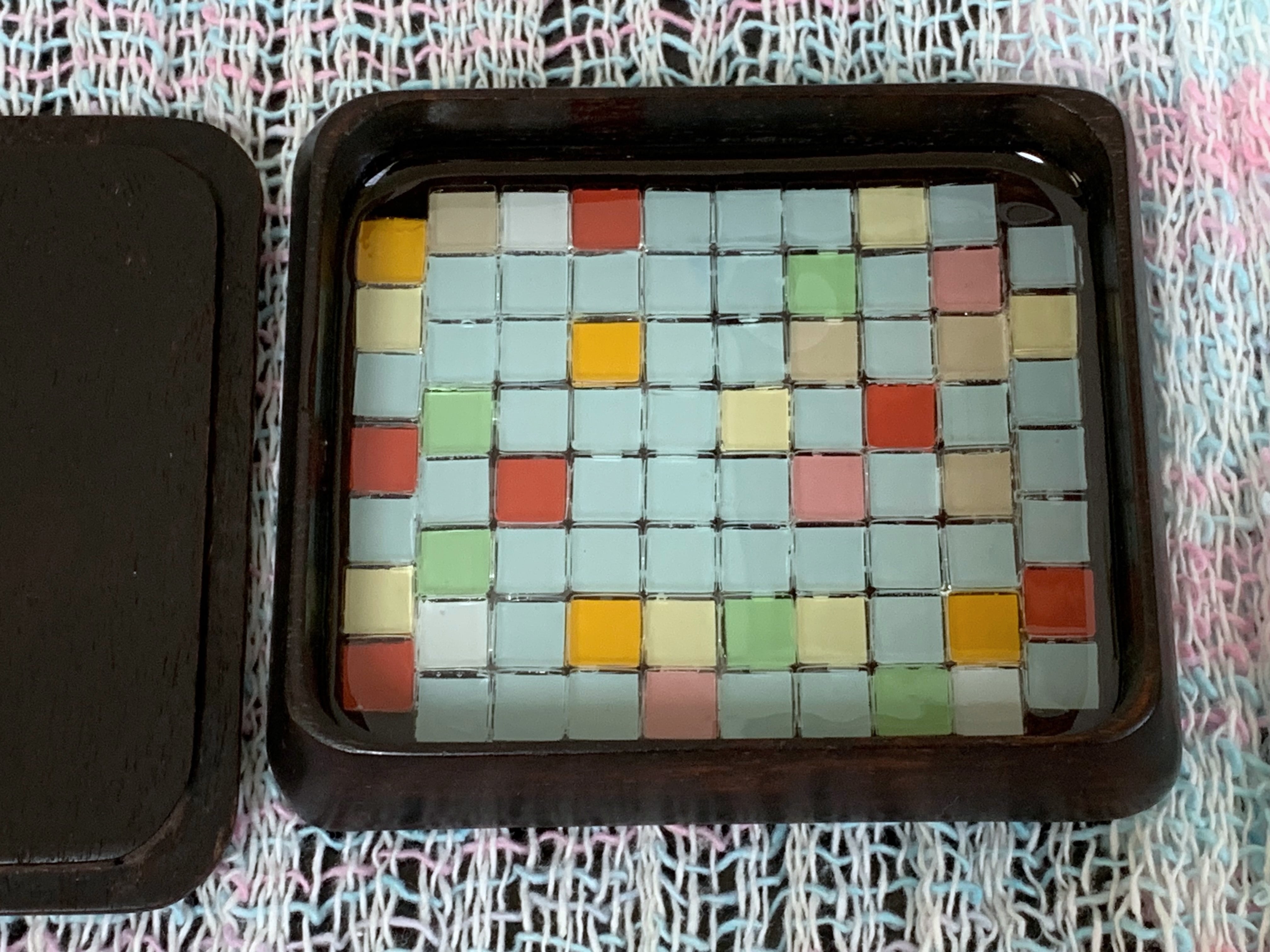 昭和前期の唐木製莨(たばこ)入れ(シガレットトレイ)の中に、ガラスモザイクタイルを並べ、透明な硬質樹脂でコーティングしてみました。